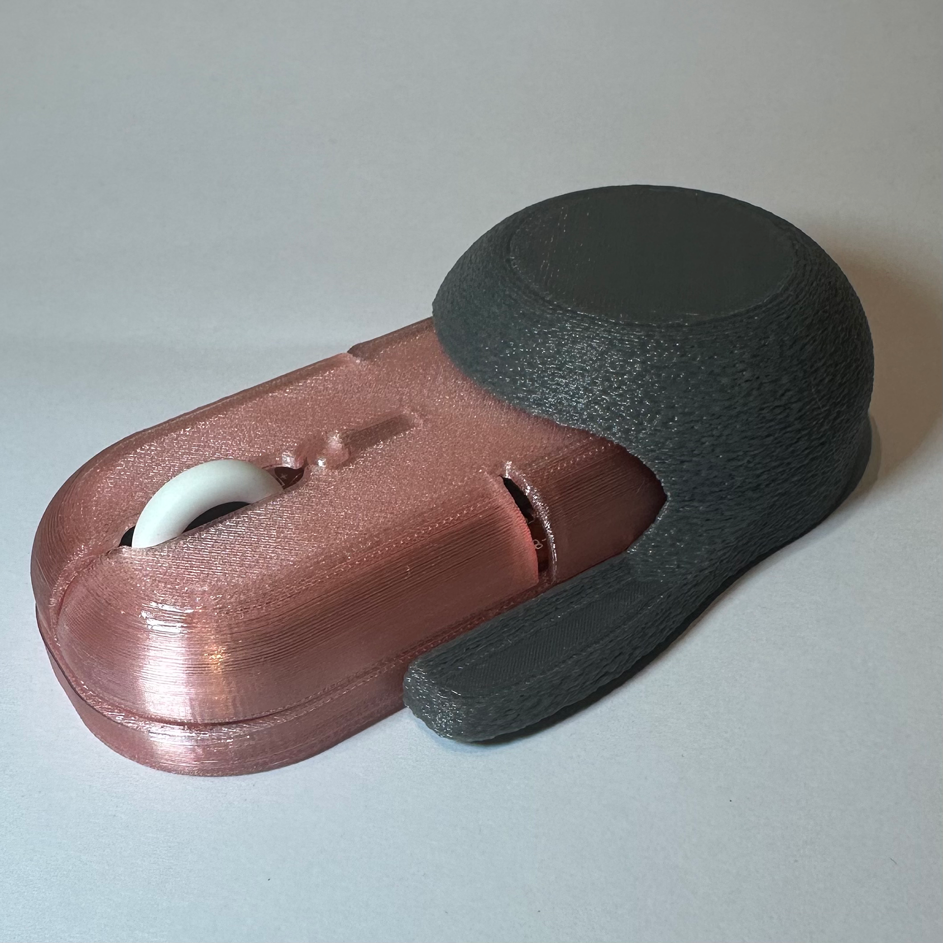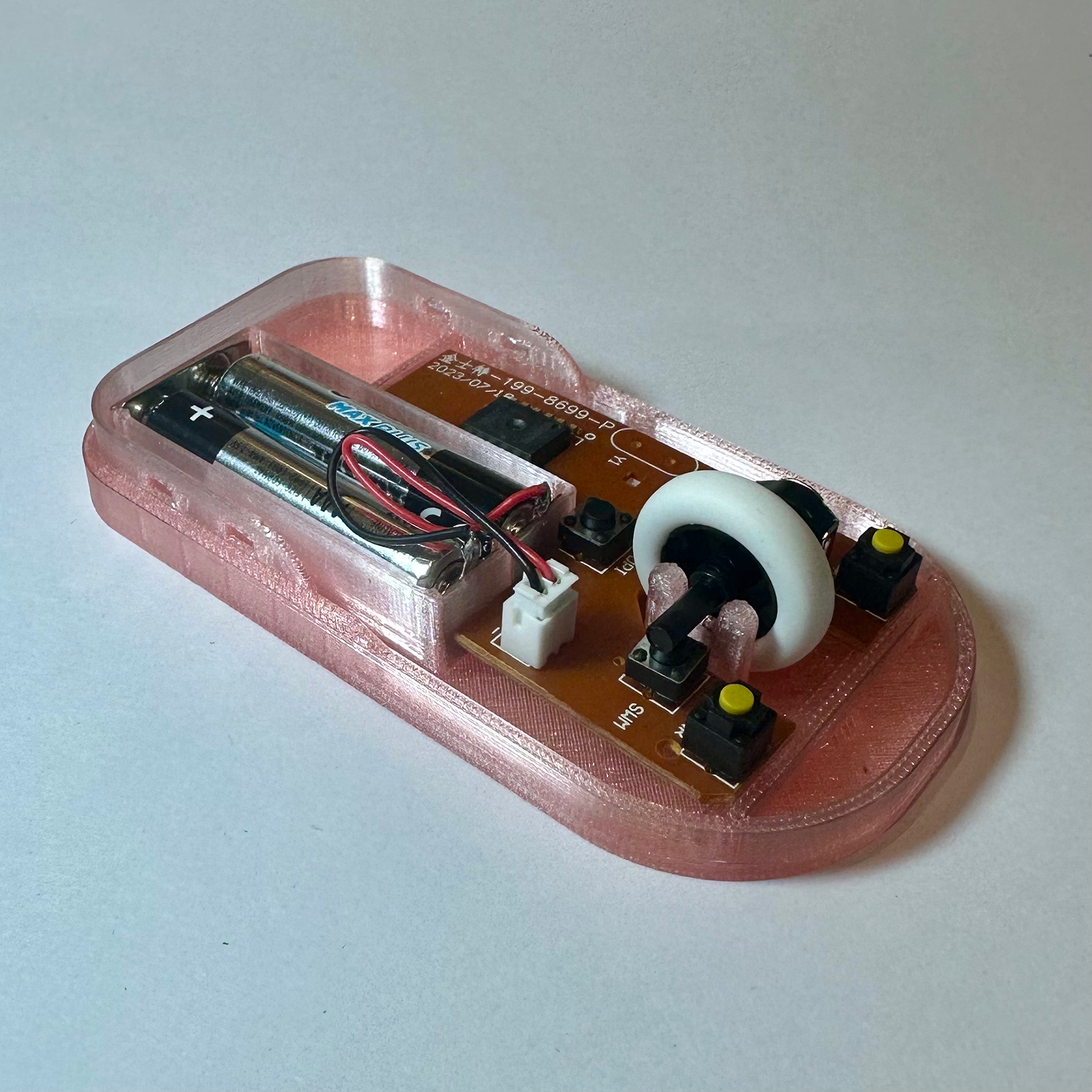 This mouse was designed around a PCB and produced with 3D printed components. A detachable ergonomic grip allows for adaptable comfort, accommodating different hand sizes and user preferences. The design merges functional electronics with tailored ergonomics, resulting in a lightweight, customisable device that enhances usability while showcasing rapid prototyping techniques.