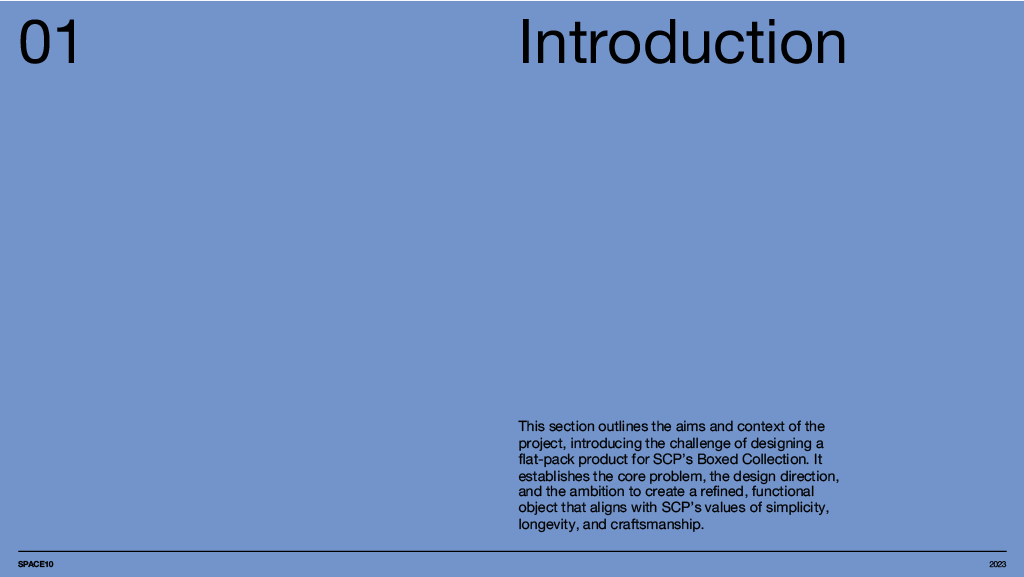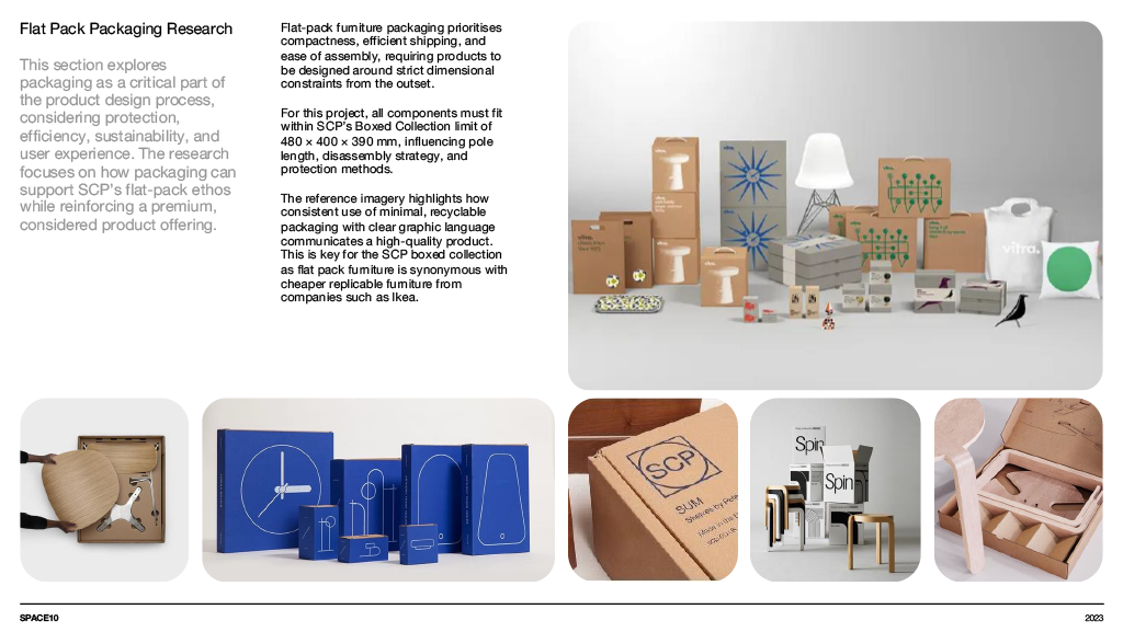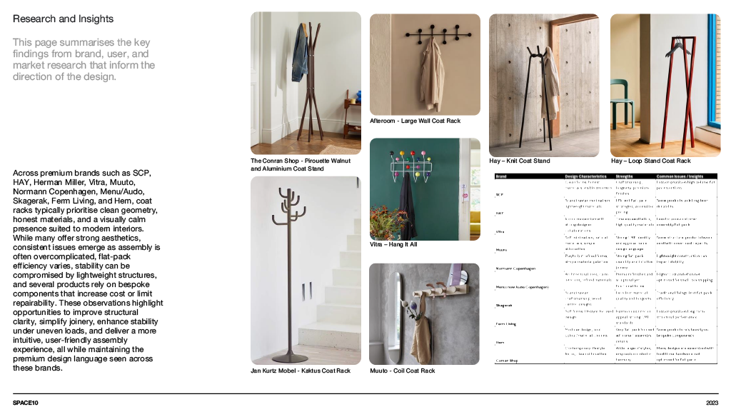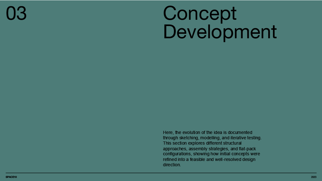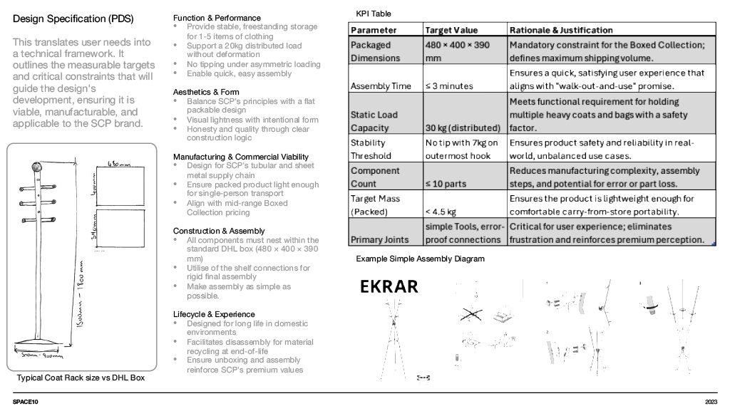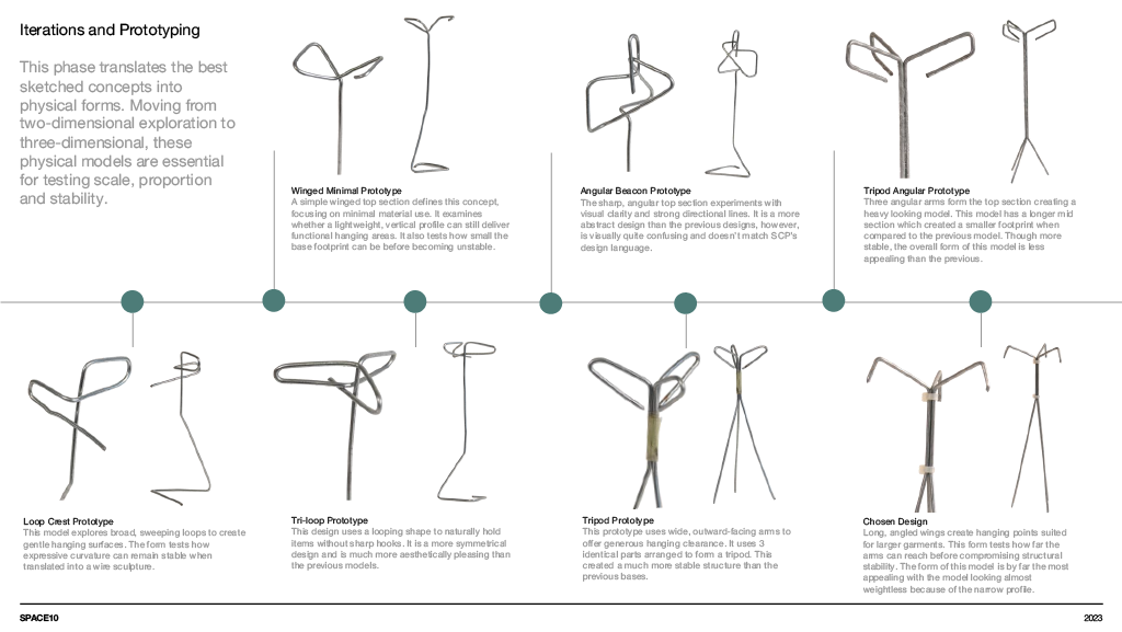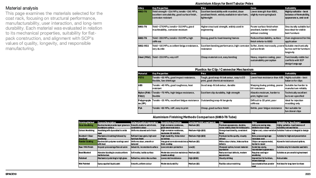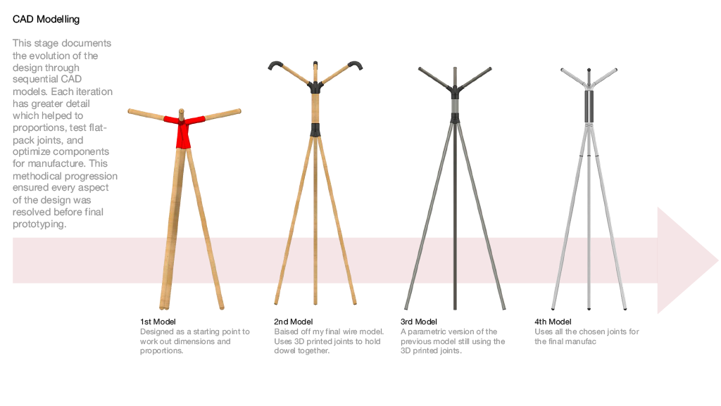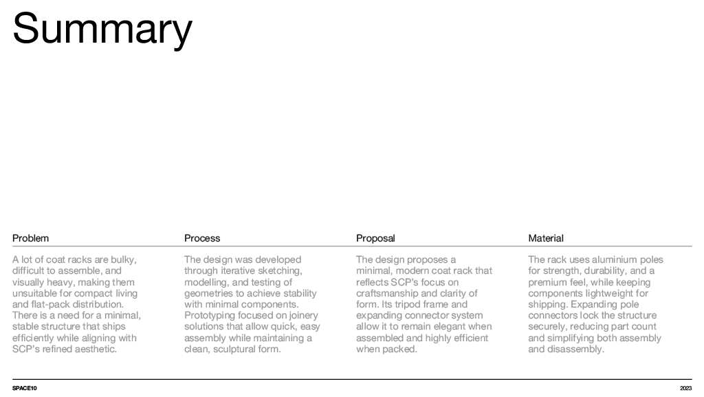 A concept furniture piece exploring flat pack efficiency through refined, bent aluminium construction. The design focuses on a lightweight coat stand that assembles into a stable tripod structure while packing neatly into SCP’s Boxed Collection format. Iterative sketching, modelling and material testing shaped a form that balances clarity, craftsmanship and modern simplicity, resulting in a sculptural object that is both compact in transit and elegant in use.