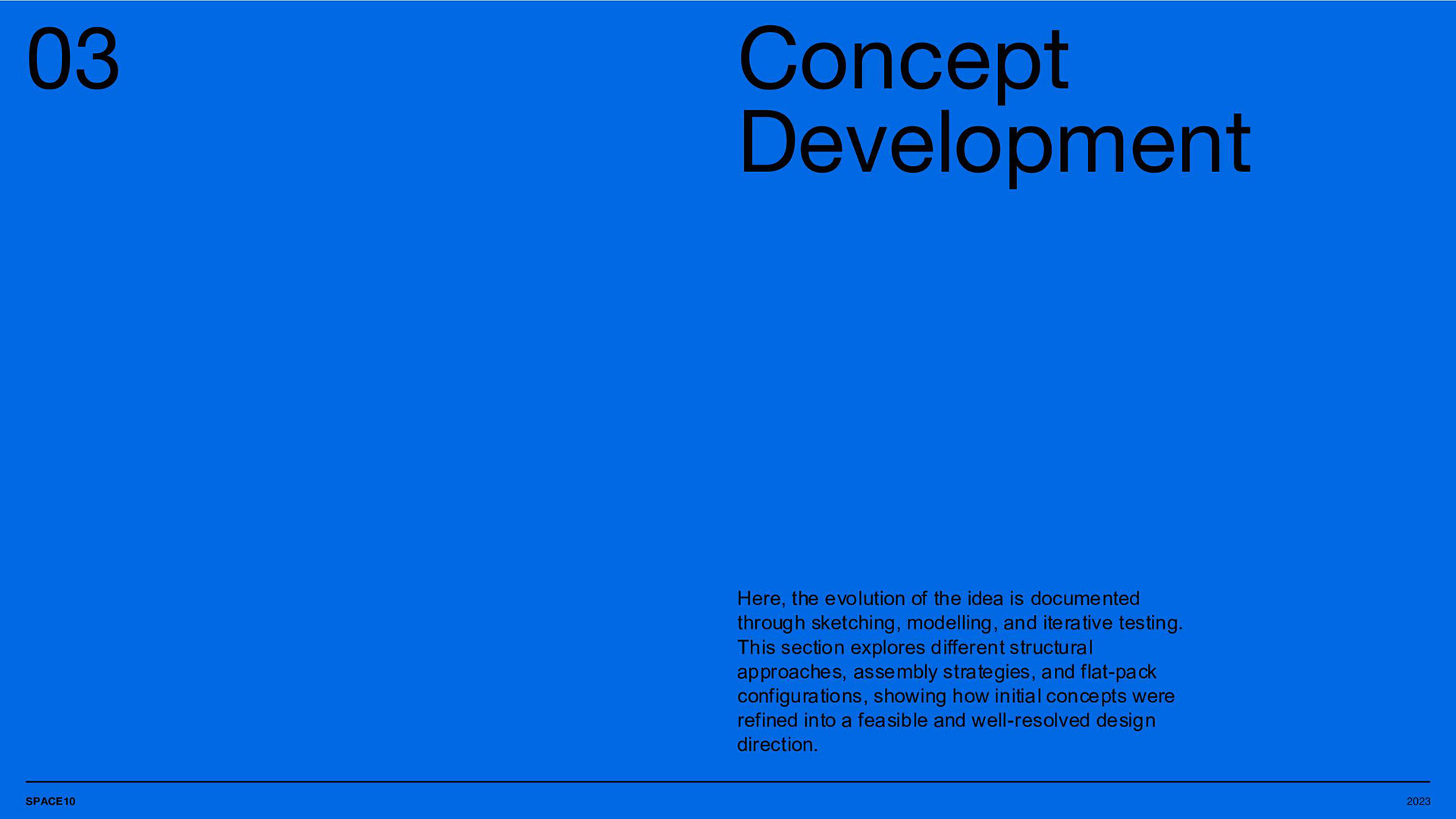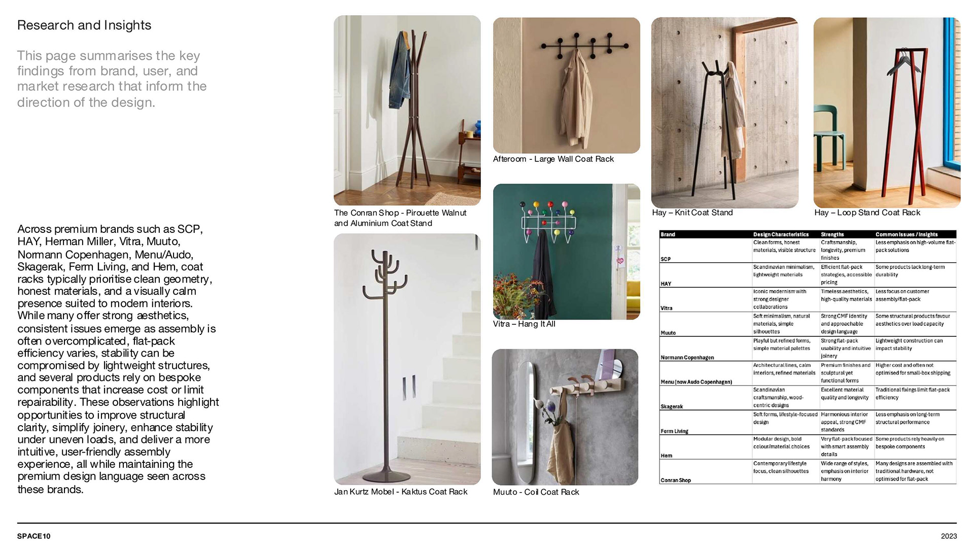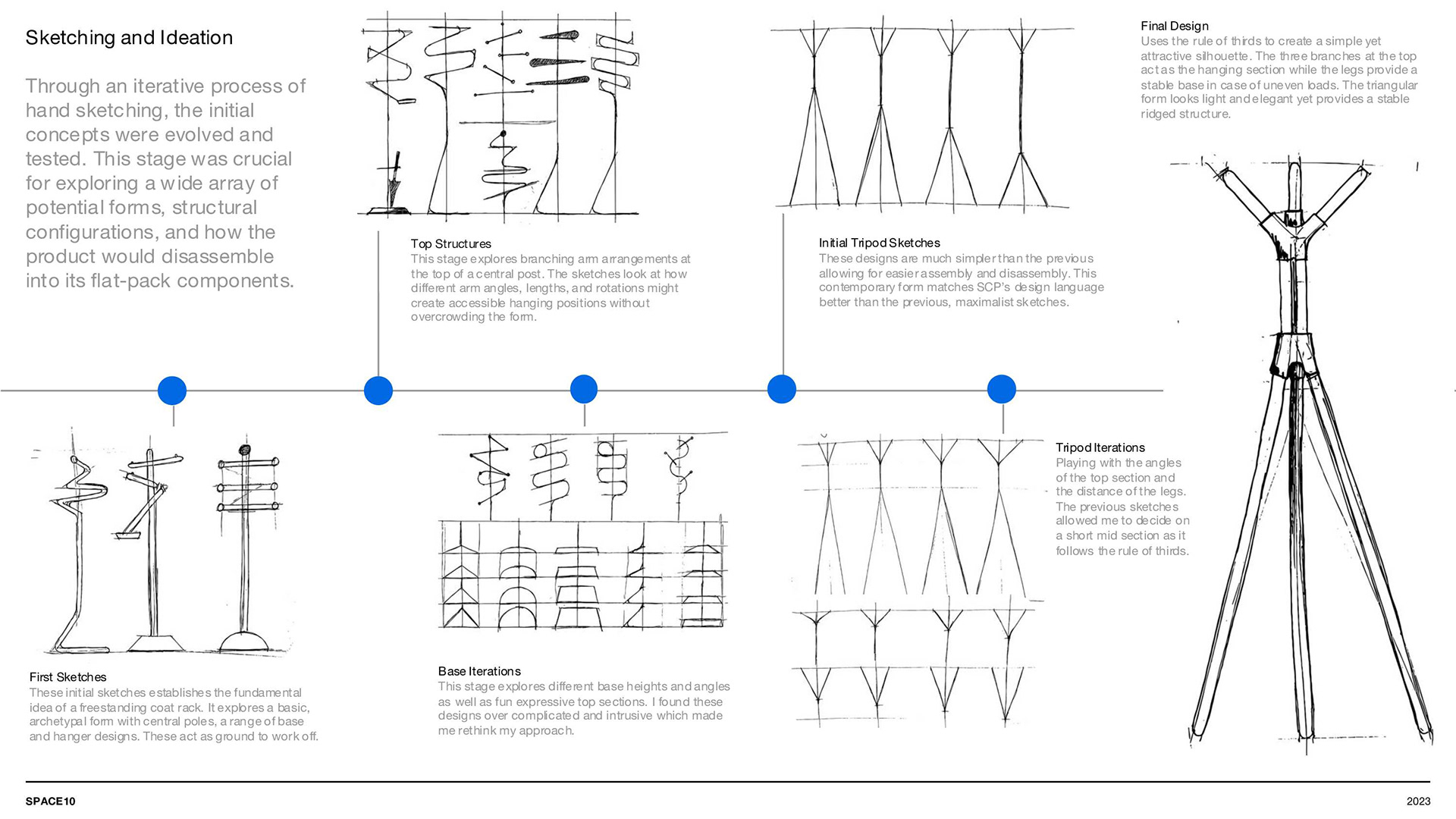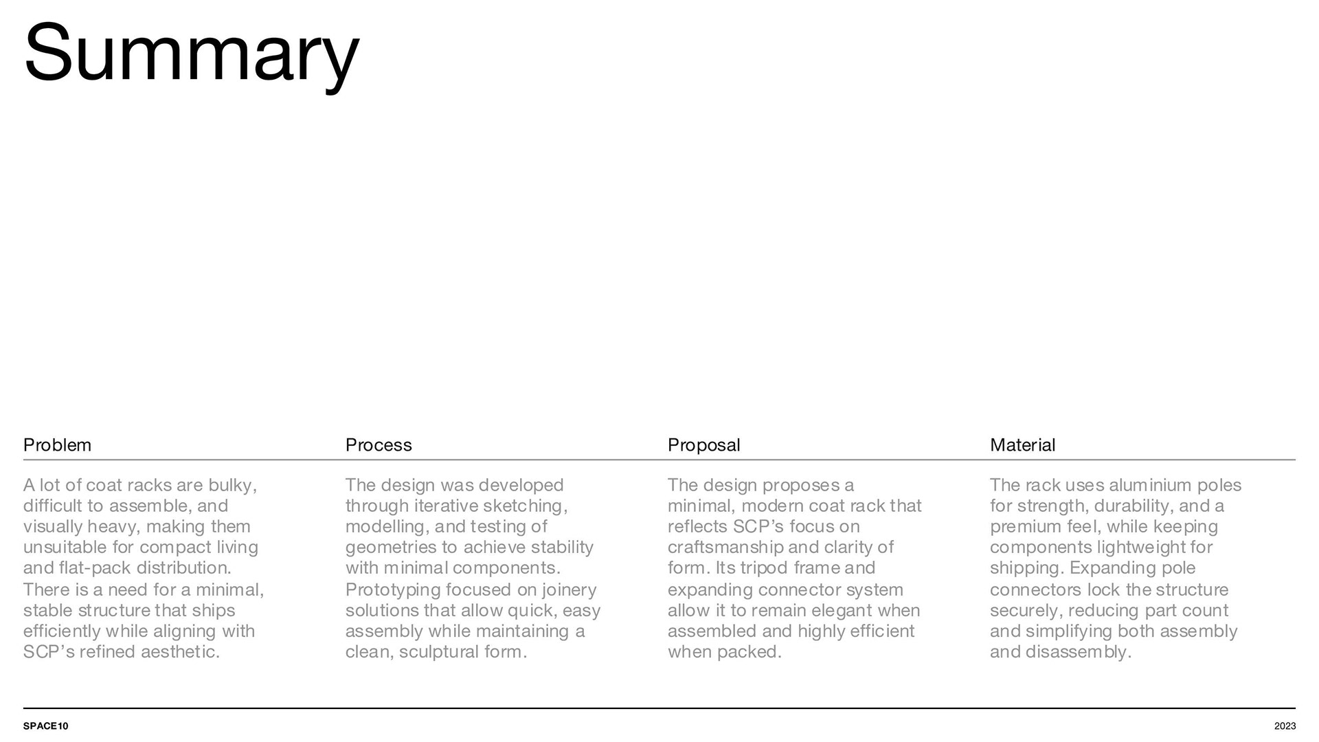 A concept furniture piece exploring flat-pack efficiency through refined, bent-aluminium construction. The design focuses on a lightweight coat stand that assembles into a stable tripod structure while packing neatly into SCP’s Boxed Collection format. Iterative sketching, modelling and material testing shaped a form that balances clarity, craftsmanship and modern simplicity, resulting in a sculptural object that is both compact in transit and elegant in use.