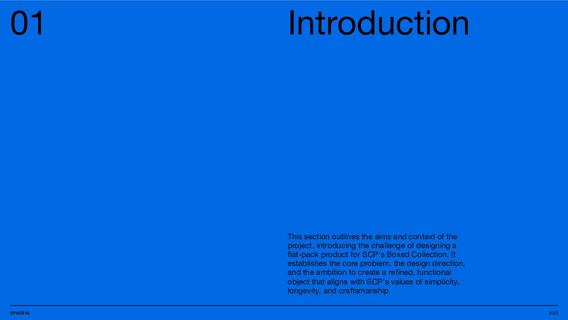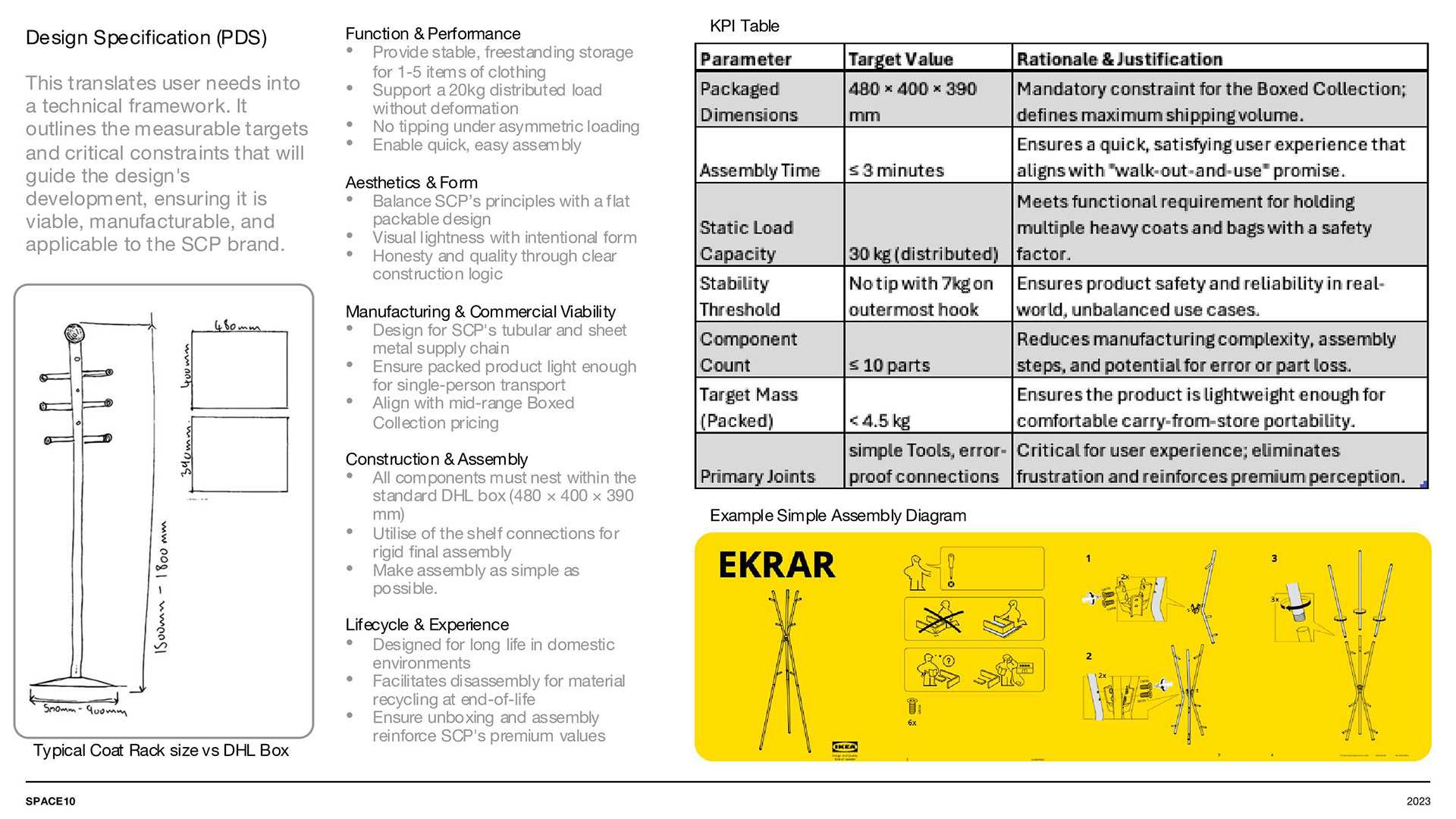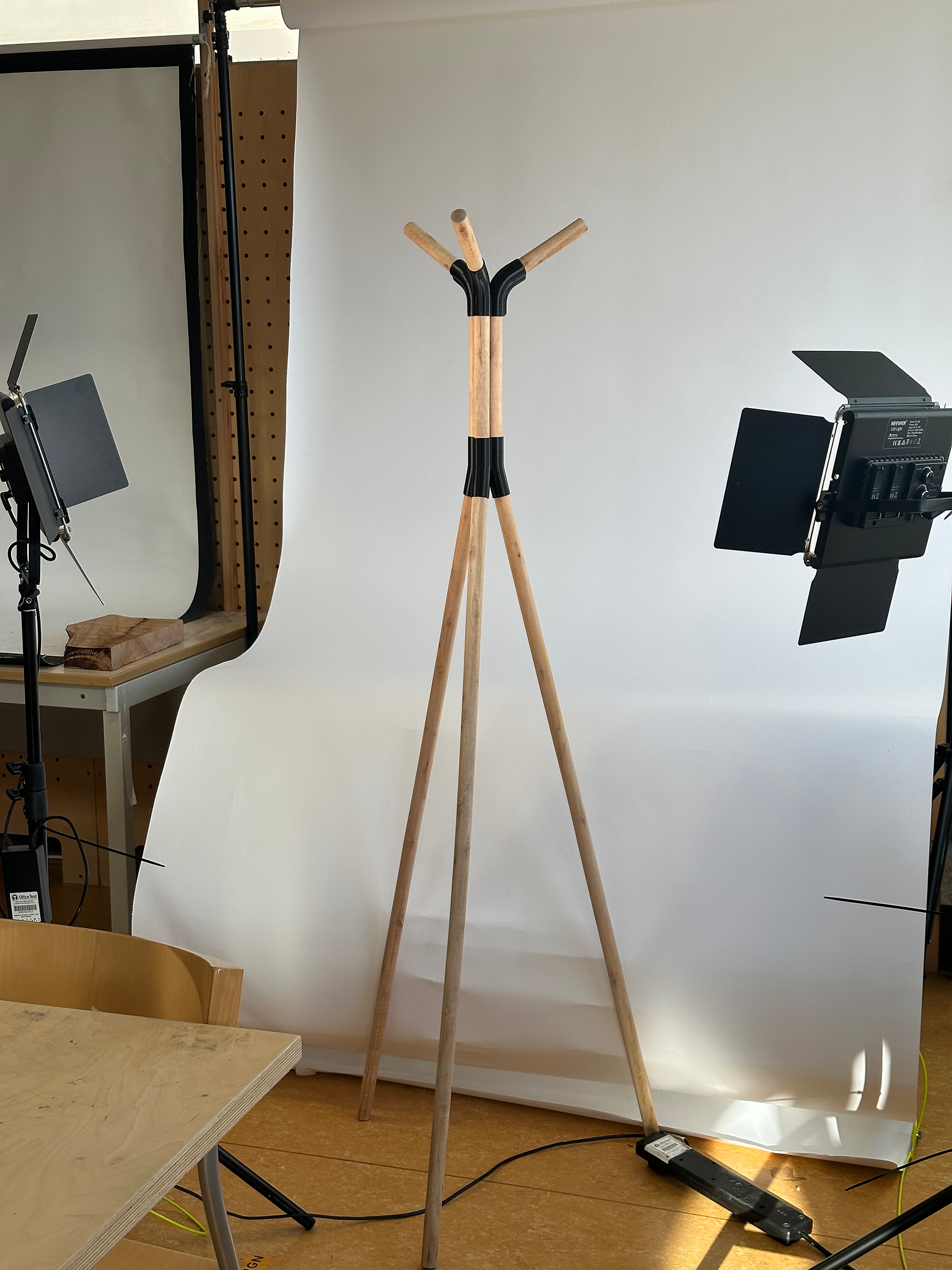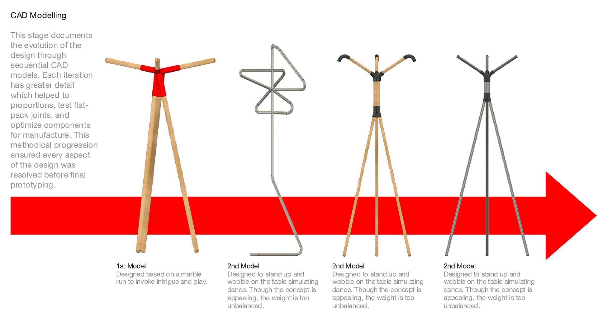 A concept furniture piece exploring flat-pack efficiency through refined, bent-aluminium construction. The design focuses on a lightweight coat stand that assembles into a stable tripod structure while packing neatly into SCP’s Boxed Collection format. Iterative sketching, modelling and material testing shaped a form that balances clarity, craftsmanship and modern simplicity, resulting in a sculptural object that is both compact in transit and elegant in use.